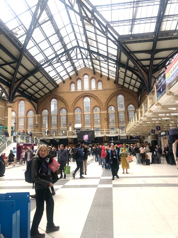 Graeme very kindly dropped us at Chelmsford station around 9am to catch our train to London (a short journey of around 50 minutes). First stop before boarding the train was breakfast (at Weatherspoons of course!). Avocado muffin and hot chocolate for Sally, and Vegetarian breakfast with hot chocolate for Kim. Sally left a memento here – her passport and credit cards – but we didn’t miss them for over a week until NZ House got in touch and told us someone had handed them in!